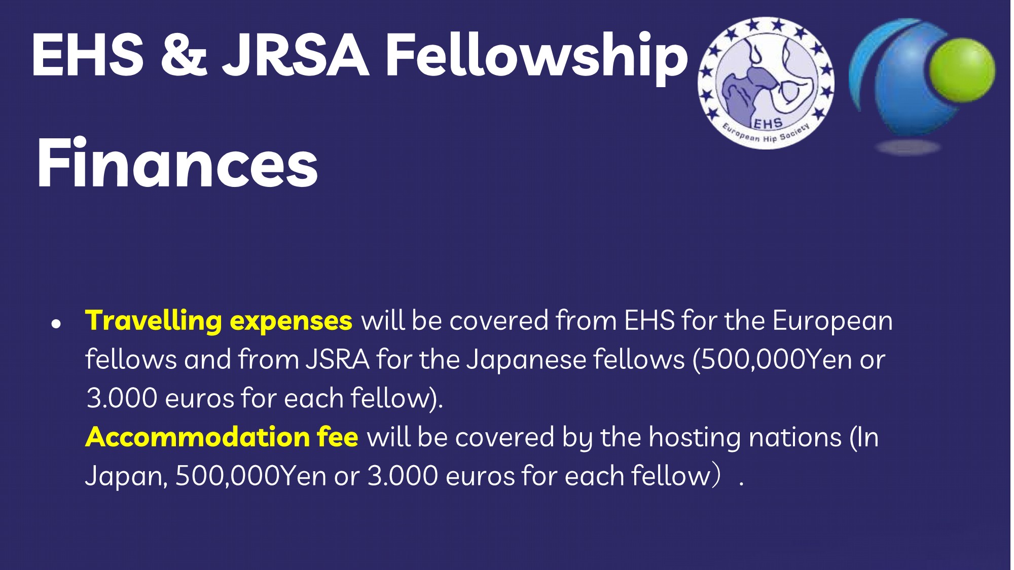 Finances: EHS to cover travelling / accomm expenses for European fellows and JSRA for Japanese fellows (¥500,000 / €3.000 per fellow).