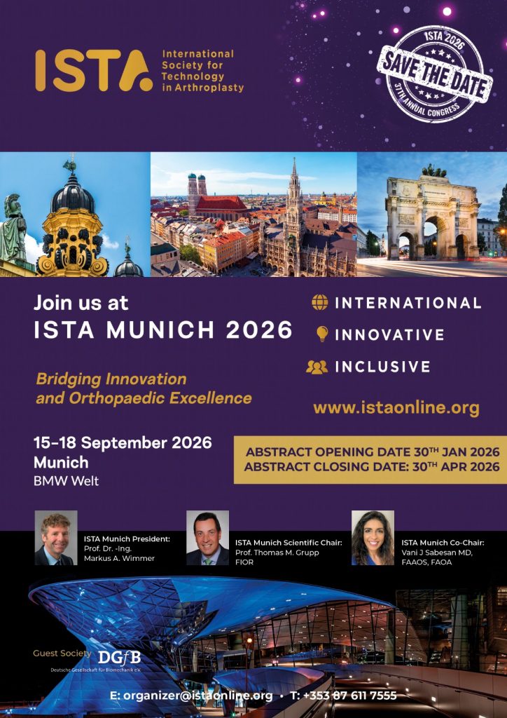 Calls for Abstracts are out from ISTA Congress (September) in Munich, Germany and the Portuguese Society of Ortho & Trauma Congress (November) in the Algarve. EHS gives patronage this month to the Barcelona Hip Meeting, in May to Current Concepts in Total Knee & Hip Arthroplasty in Bukovel, Ukraine, in June the FORTE Summer School in Catanzaro, Italy, in September the new Femoral Fragility Trauma Masterclass in Birmingham, UK (this will alternate each year between Bern and Birmingham), in October to the Osteotomies Around the Hip course in Lisboa, Portugal and in November the Italian Society of Orthopaedics and Traumatology Congress. See our Hip Calendar for more info.